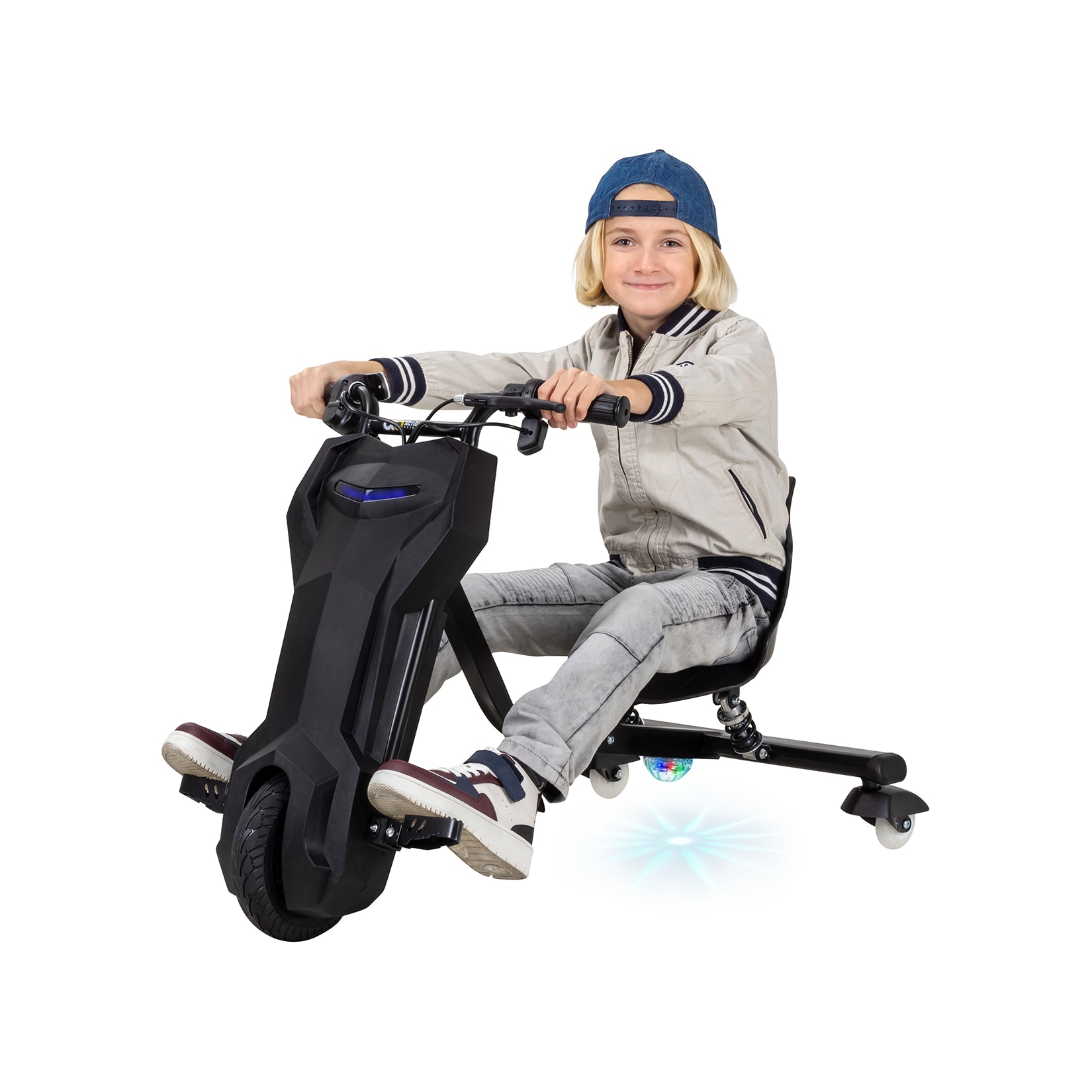 Das auffällige schwarze Design des Elektro-Drift-Trike 360 ist nicht nur ein Hingucker, sondern auch Ausdruck von Stärke und Individualität. Die robuste Konstruktion garantiert Langlebigkeit und Sicherheit, während die ergonomische Sitzposition für maximalen Komfort sorgt, selbst bei längeren Fahrten. Die integrierte LED-Beleuchtung sorgt nicht nur für zusätzliche Sicherheit bei Dunkelheit, sondern verleiht dem Trike auch einen futuristischen Look, der alle Blicke auf sich zieht.