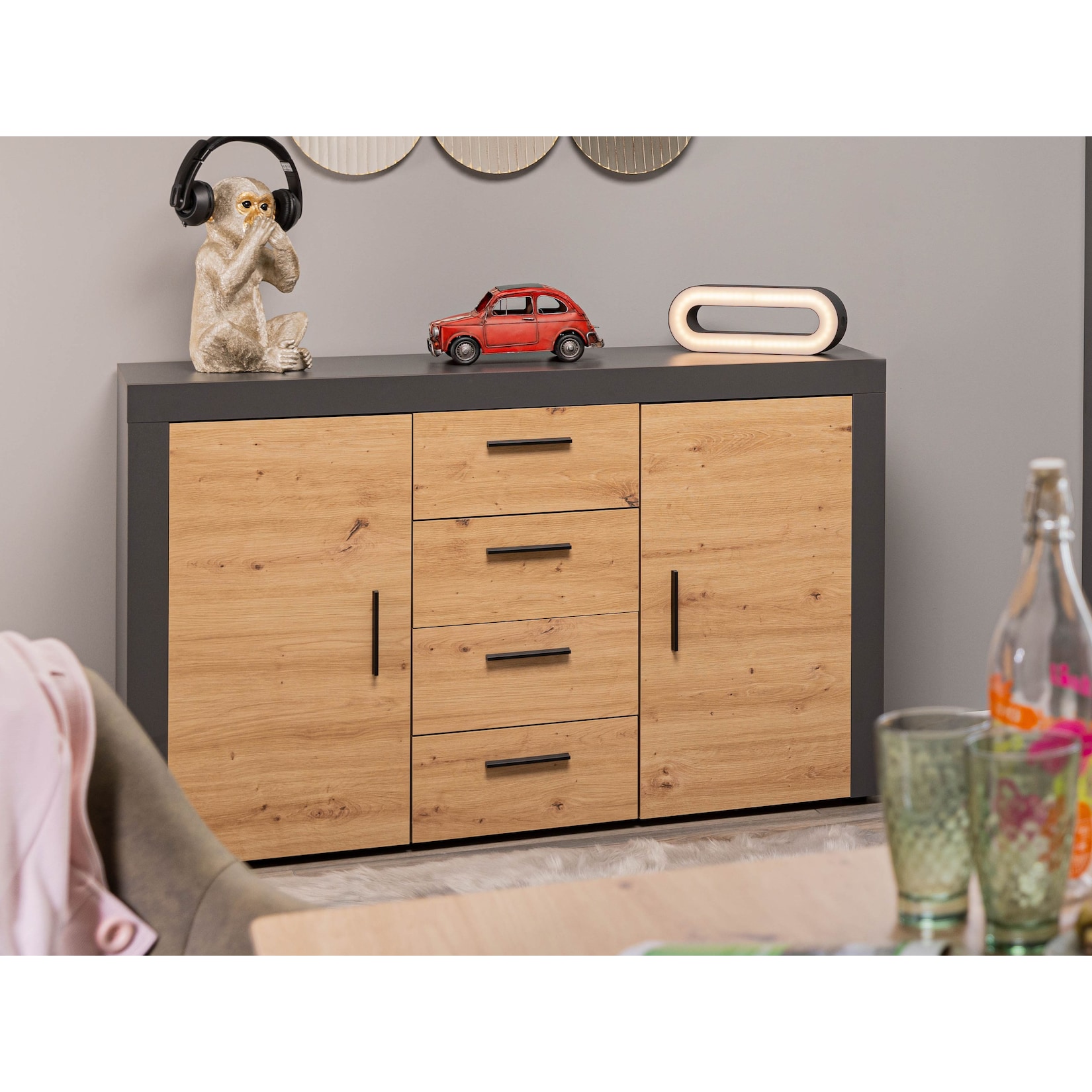 Das Design der Corbeto Kommode besticht durch seine klaren Linien und die harmonische Kombination aus Anthrazit und Eiche Artisan Nachbildung. Die dunkle Anthrazit-Farbe verleiht dem Sideboard eine moderne und edle Note, während die Eiche Artisan Nachbildung einen warmen, natürlichen Akzent setzt. Diese Kombination macht die Kommode zu einem vielseitigen Möbelstück, das sich nahtlos in verschiedene Einrichtungsstile einfügt – vom modernen Loft bis zum gemütlichen Landhaus.
