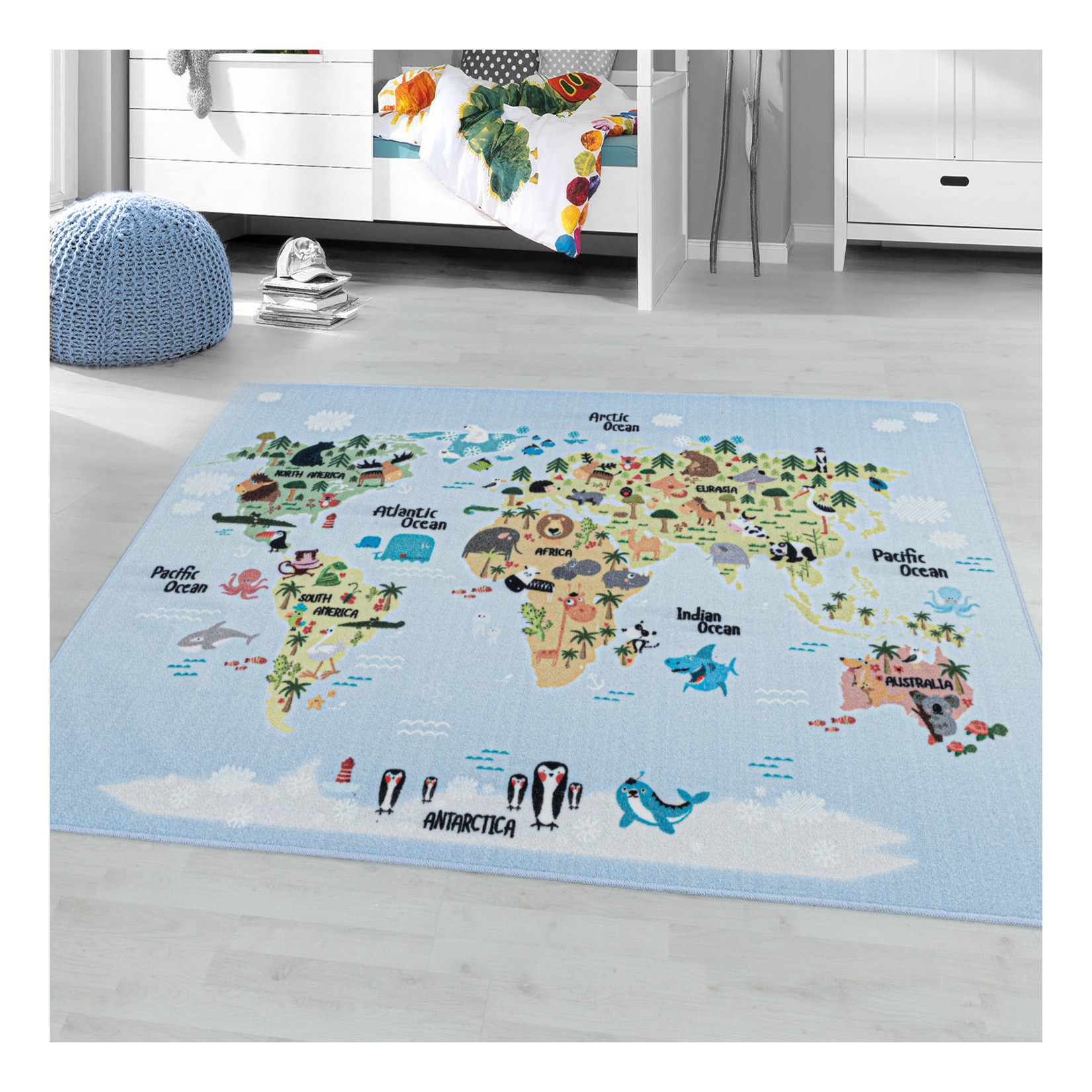 Entdecke die Welt spielend leicht mit unserem Kinderteppich Weltkarte mit Tieren