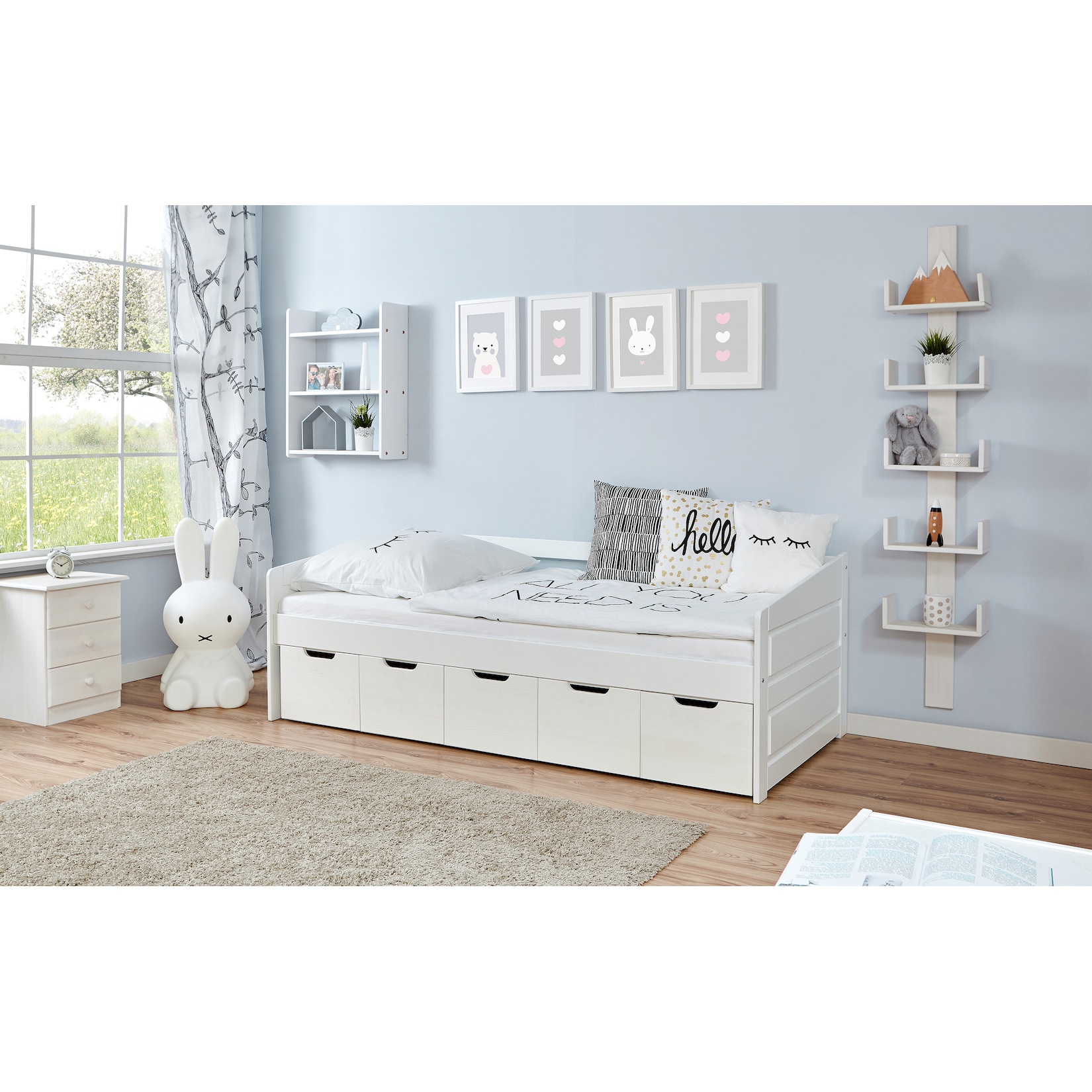 Die Oberfläche ist mit einer umweltfreundlichen, wasserbasierten Lackierung in Weiß versehen, die nicht nur optisch ansprechend ist, sondern auch pflegeleicht und strapazierfähig ist. So bleibt dein Sofabett lange schön und sauber.
