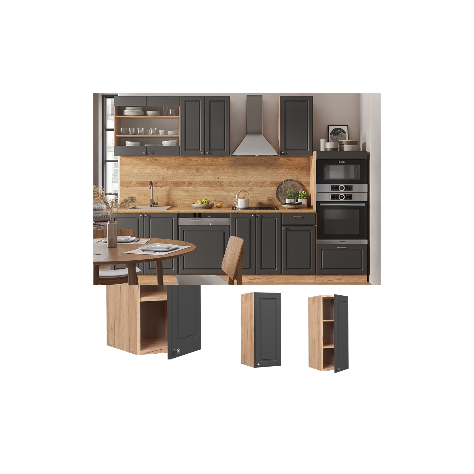 Dieser 30 cm breite Hängeschrank fügt sich nahtlos in jede Küchenzeile oder Einbauküche ein und bietet gleichzeitig wertvollen Stauraum. Die Kombination aus Eiche-Dekor, anthrazitfarbenen Elementen und goldenen Akzenten verleiht Ihrer Küche einen Hauch von Luxus und Wärme. Lassen Sie sich von der hochwertigen Verarbeitung und dem durchdachten Design begeistern.