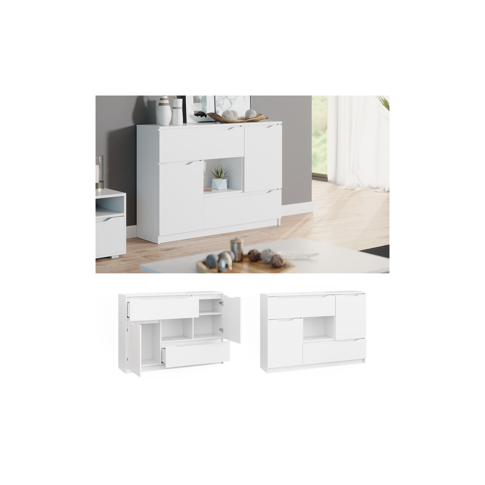 - Farben und Kontraste: Spielen Sie mit Farben und Kontrasten, um die Kommode hervorzuheben. Kombinieren Sie das weiße Sideboard mit farbenfrohen Deko-Elementen oder setzen Sie auf monochrome Töne für einen eleganten Look.