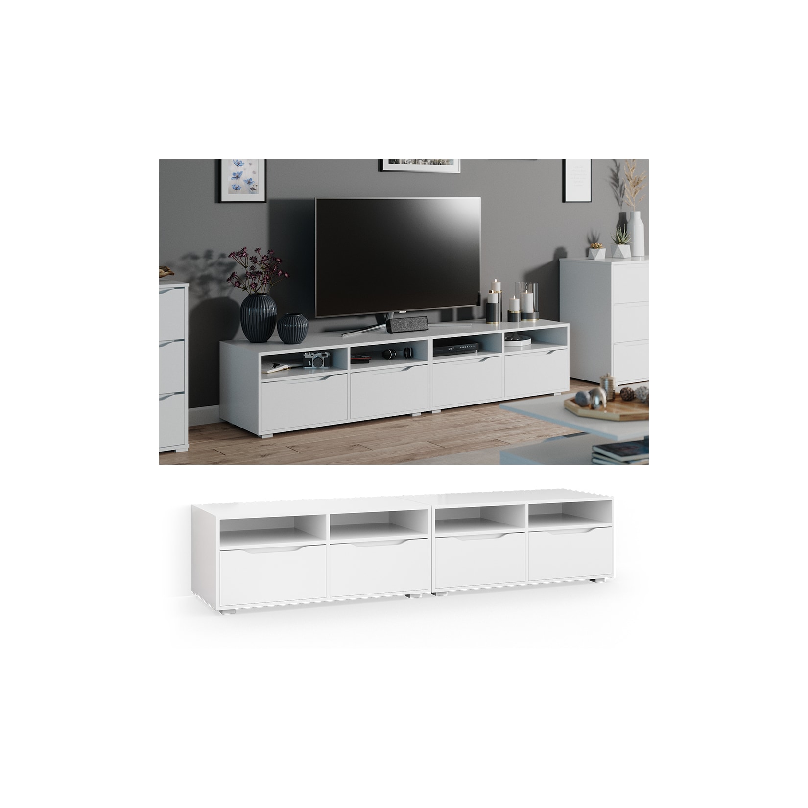 Das Vicco Lowboard Ruben besticht durch seine klaren Linien und die schlichte Eleganz des weißen Designs. Es fügt sich nahtlos in verschiedene Einrichtungsstile ein, von modern bis klassisch, und verleiht deinem Wohnzimmer eine frische und freundliche Atmosphäre. Aber das Lowboard ist nicht nur ein Blickfang, sondern auch äußerst funktional. Mit einer Breite von 200 cm bietet es genügend Platz für deinen Fernseher, deine Spielekonsole, deinen Blu-ray-Player und weitere Mediengeräte. Die offenen Fächer und Schubladen sorgen für Ordnung und ermöglichen es dir, deine Lieblingsstücke stilvoll zu präsentieren.