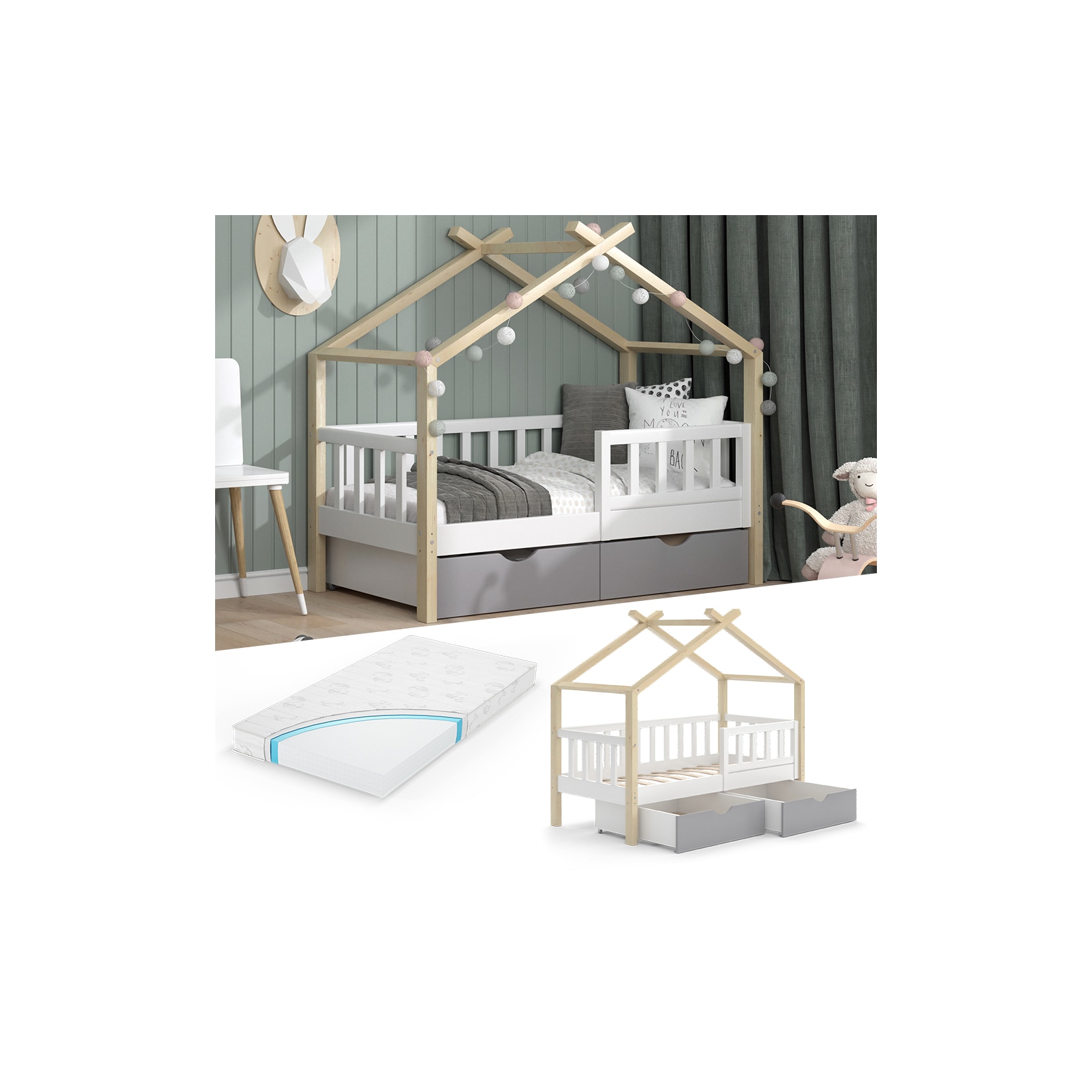 Das VitaliSpa Hausbett besticht durch sein skandinavisch inspiriertes Design in Weiß, Grau und Naturholz. Die klaren Linien und die offene Hausform verleihen dem Bett eine moderne und freundliche Optik, die sich harmonisch in jedes Kinderzimmer einfügt. Die offene Gestaltung fördert die Fantasie und lädt zum Spielen ein. Ihr Kind kann das Bett mit Lichterketten, Stofftieren oder anderen Dekorationen ganz nach seinen Vorstellungen gestalten und sich so sein eigenes kleines Reich erschaffen.