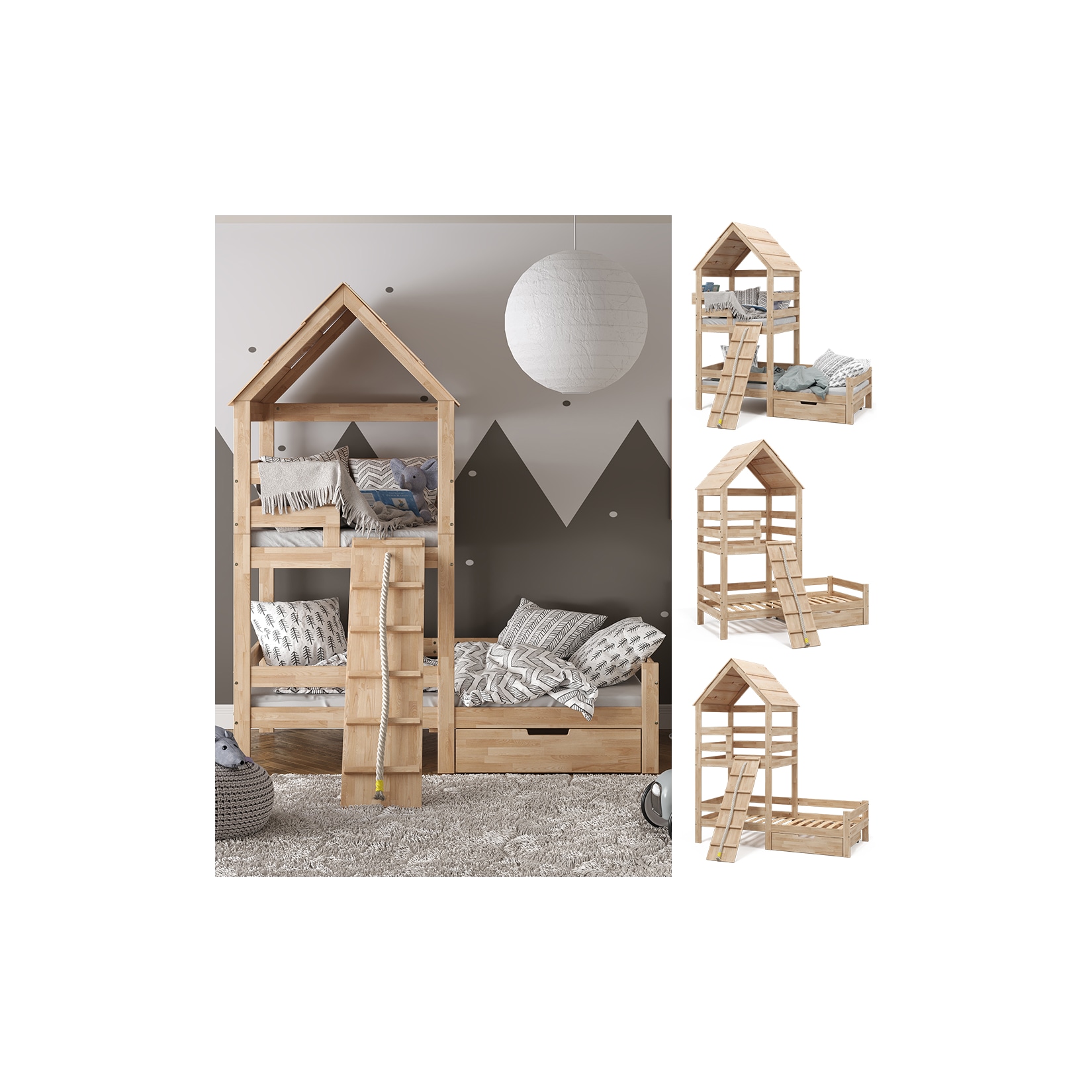 - Besonderheiten: Modernes Design, robuste Konstruktion, abgerundete Kanten, kindgerechte Leiter, geräumige Spielhöhle, zusätzlicher Stauraum durch Bett Schublade